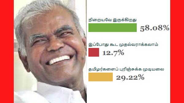 "இப்போதுகூட முதல்வராக்கலாம்" என்ற ஆப்ஷனுக்கு 12.7 சதவீதம் பேரும், "தமிழர்களை புரிஞ்சிக்க முடியலை" என்ற ஆப்ஷனுக்கு 29.22 சதவீதம் பேரும் வாக்களித்துள்ளனர். பெரும்பாலானோர் இன்னமும் நல்லகண்ணு மீதான நம்பிக்கையை, அபிமானத்தை, அளவுக்கு அதிகமாக வைத்துள்ளது ஆச்சரியத்தை தருகிறது.. மேலும் இப்போதுள்ள அரசியல் சூழலில், வாசகர்களுக்கு இருக்கும் அதிருப்தியும் வெளிப்படுகிறது.