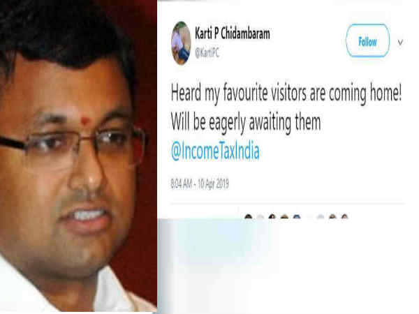 சென்னை: வருமான வரித்துறை அதிகாரிகள் தனது வீட்டுக்கு ரெய்டு நடத்த வர உள்ளதாக முன்னாள் மத்திய அமைச்சர் ப.சிதம்பரம் மகன் கார்த்தி சிதம்பரம் ட்வீட் வெளியிட்டுள்ளது பரபரப்பை ஏற்படுத்தியுள்ளது.