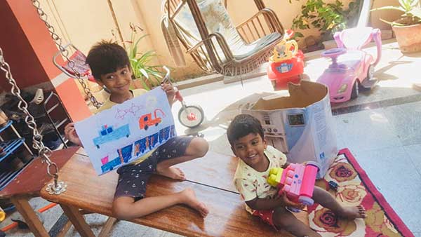 இது நமது வாசகர் பொய்கைவளவன் வீட்டுக் குட்டீஸ். பொய்கைவளவனுக்கு இரு மகன்கள். மூத்தவர் அபிஷேக், 5 வயது. இரண்டாவது பையன் பிரணவ், 3 வயது. இருவரும் சென்னை மாடம்பாக்கத்தில் வசித்து வருகின்றனர். இந்த லாக்டவுன் சமயத்தில் வீட்டில் சேட்டை செய்யாமல் படம் வரைவது, கேரம் விளையாடுவது, வீட்டை சுத்தப்படுத்துவது, அம்மாவுக்கு உதவுவது என அசத்துகின்றனர்.. சமத்துப் பசங்க.. !