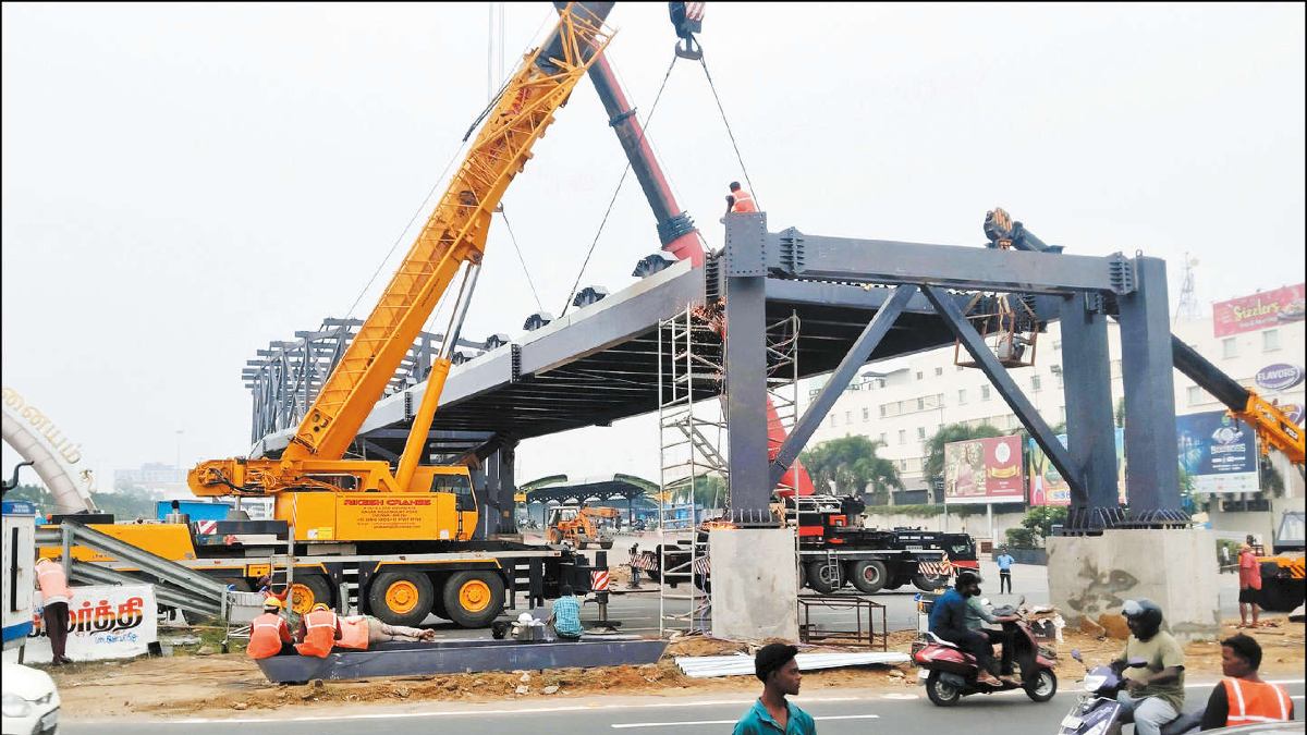 இதன் ஒரு பகுதியாக பெரும் சவாலான பணியான கிளாம்பாக்கம் பேருந்து நிலையத்தில் இருந்து ஜி.எஸ்.டி. சாலையின் நடுவே ஆகாய நடைபாதைக்கான அடித்தளத்தை தூக்கி நிறுத்தும் பணி நேற்று நடைபெற்றது. ராட்சத கிரேன் எந்திரங்களின் உதவியுடன் இந்த பணி நடைபெற்றது. இதற்காக சிறிது நேரம் அந்த பகுதியில் போக்குவரத்து மாற்றப்பட்டு இருந்தது.
