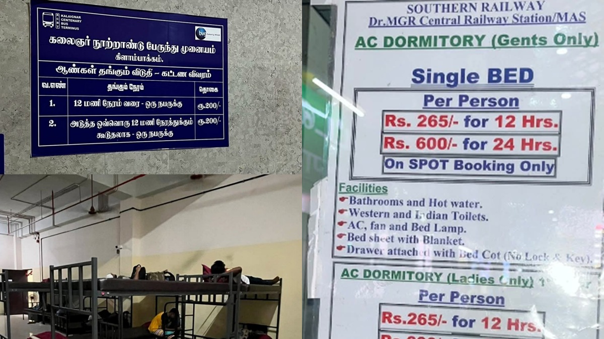 சென்னை : சென்னைக்கு வேலை காரணமாக வரும் பலர் எங்கு தங்குவது.. எவ்வளவு ரூபாய் செலவாகும் என்பது குறித்த சந்தேகங்கள் இருக்கும்.. அதேபோல் ஒரே ஒரு நாள் வந்து செல்பவர்கள் அதிகம்.. 200 ரூபாய் முதல் 500 ரூபாய் செலவு செய்து பேருந்து மற்றும் ரயில்களில் ஏறி வரும் சாமானிய மக்கள் அறை எடுத்து தங்குவதற்கு, கிளாம்பாக்கம் மற்றும் சென்னை சென்ட்ரல் ரயில் நிலையங்களில் குறைந்த செலவில் வசதிகள் உள்ளன. அவற்றின் விவரங்களை இந்த பதிவில் பார்ப்போம்.