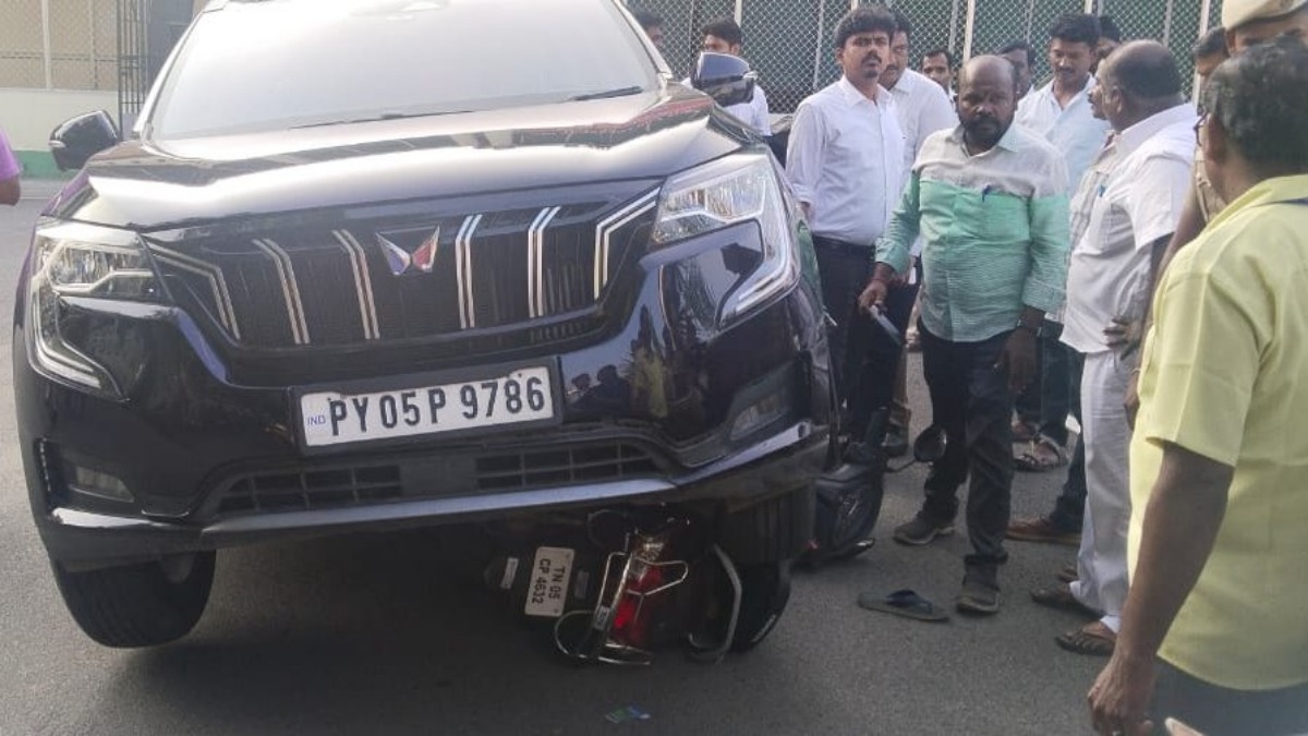 அங்கு அமுதா ஐஏஎஸ்ஸை சந்தித்து மனு கொடுத்துவிட்டு திரும்பினர். அப்போது காரை பார்க்கிங்கில் விட்டிருந்த நிலையில் அதை எடுத்து வர ஓட்டுநரிடம் கூறினர். அப்போது அந்த கார் இரு சக்கர வாகனத்தில் வந்த பெண் மீது மோதியது. காருக்கு அடியில் இரு சக்கர வாகனம் சிக்கியுள்ளது. அதை எடுப்பதற்கு போராடி வருகிறார்கள். இதனால் தலைமைச் செயலக வளாகத்தில் பரபரப்பு ஏற்பட்டது.