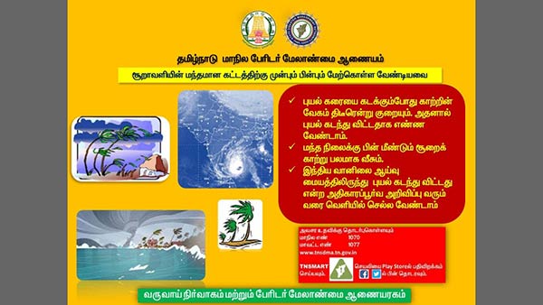 புயல் அறிவிப்புகள், அறிவுரைகளை தொடர்ந்து கேட்டு வாருங்கள். அதிகாரப்பூர்வமான அறிவிப்புகள், அறிவுரைகளுக்கு வானொலி, தொலைக்காட்சி மற்ரும் தமிழ்நாடு பேரிடர் மேலாண்மை ஆணையத்தின் முகநூல், ட்விட்டர் பக்கங்களை பின் தொடர்ந்து வாருங்கள்.