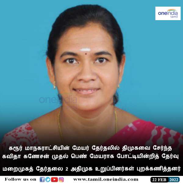 கரூர் மாநகராட்சியின் மேயர் தேர்தலில் திமுகவை சேர்ந்த கவிதா கணேசன் முதல் பெண் மேயராக போட்டியின்றித் தேர்வு .