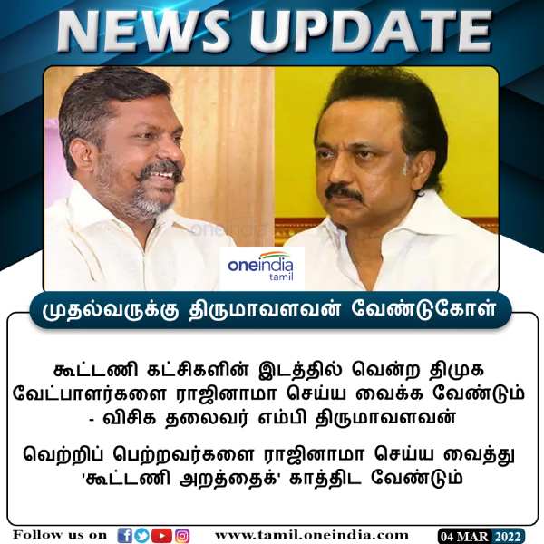 கூட்டணி கட்சிகளின் இடத்தில் வென்ற திமுக வேட்பாளர்களை ராஜினாமா செய்ய வைக்க வேண்டும் - விசிக திருமாவளவன்.