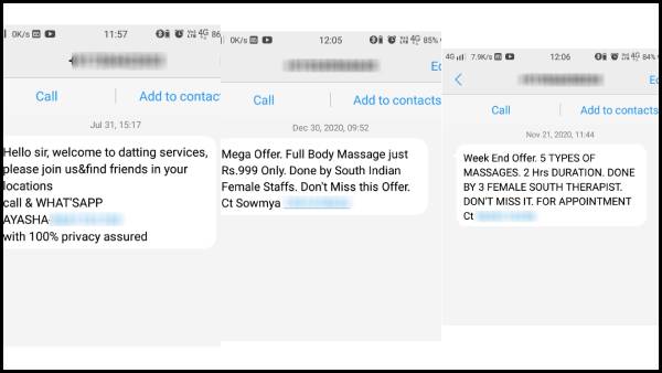 அது போல் வார இறுதி நாட்களில் ஆஃபர் என கூறி 5 விதமான மசாஜ்கள், 2 மணி நேரம் செய்யப்படும். தென்னிந்தியாவைச் சேர்ந்த 3 பெண்களால் செய்யப்படுகிறது என குறிப்பிட்டு முன்பதிவு செய்யுமாறு ஒரு எண்ணையும் கொடுக்கிறார்கள். அது போல் மெகா ஆஃபர் , முழு உடல் மசாஜ் வெறும் 999 ரூபாய் மட்டுமே. இந்த சலுகையை நழுவவிடாதீர்கள் என்கிறது ஒரு மெசேஜ்.