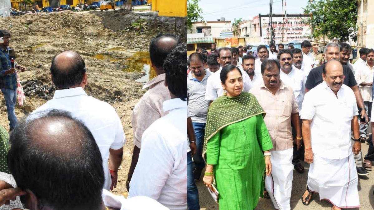 தமிழ்நாடு நகர்ப்புற வாழ்விட மேம்பாட்டு வாரியத்தின் சார்பில் கட்டப்பட்டுள்ள குடியிருப்புகளை ஆய்வு செய்வதற்காக சென்னை சோழிங்கநல்லூர் பகுதியில் உள்ள கண்ணகி நகர், எழில் நகருக்கு சென்றிருந்தார் அமைச்சர் தாமோ அன்பரசன். அப்போது கழிவுநீர் செல்ல வழியில்லாமல் குடியிருப்பு கட்டிடங்களை ஒட்டி கொதகொதவென்று தேங்கி நின்றது.