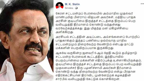 ஆகவே வருகின்ற ஜனவரி 6-ஆம் தேதி கூடும் தமிழ்நாடு சட்டமன்ற பேரவைக் கூட்டத்தில், இந்தியாவில் பெரும்பான்மை மக்களின் எதிர்ப்புக்கு உள்ளாகியிருக்கும், குடியுரிமை திருத்தச் சட்டத்தை திரும்பப் பெற வலியுறுத்தி முதலமைச்சர் பழனிச்சாமி தீர்மானம் கொண்டு வந்து நிறைவேற்ற வேண்டும் என்று பிரதான எதிர்க்கட்சியான திராவிட முன்னேற்றக் கழகத்தின் சார்பில் வலியுறுத்தி கேட்டுக் கொள்கிறேன்.
