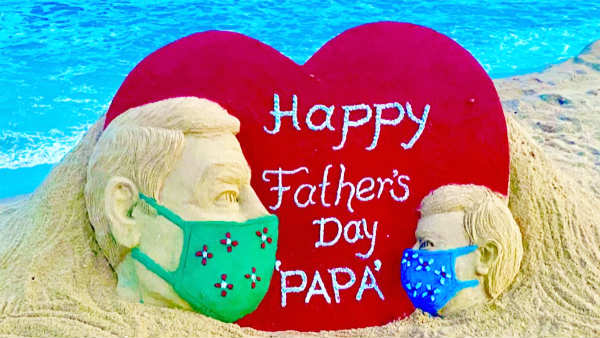 மணற் சிற்ப கலைஞரின் தந்தையர் தின சிற்பம் ஒடிசாவில் உள்ள பூரி கடற்கரையை அலங்கரிக்கிறது. அப்பாவும் மகனும் அதில் மாஸ்க் அணிந்திருப்பதுதான் கூடுதல் சிறப்பு.