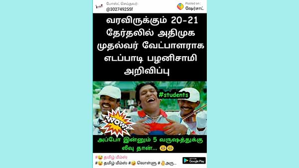 இந்த நிலையில் முதல் வேட்பாளராக மீண்டும் எடப்பாடி பழனிச்சாமியே தேர்வு செய்யப்பட்டதை மாணவர்கள் வரவேற்று மீம்ஸ் போட்டுள்ளார்கள்.