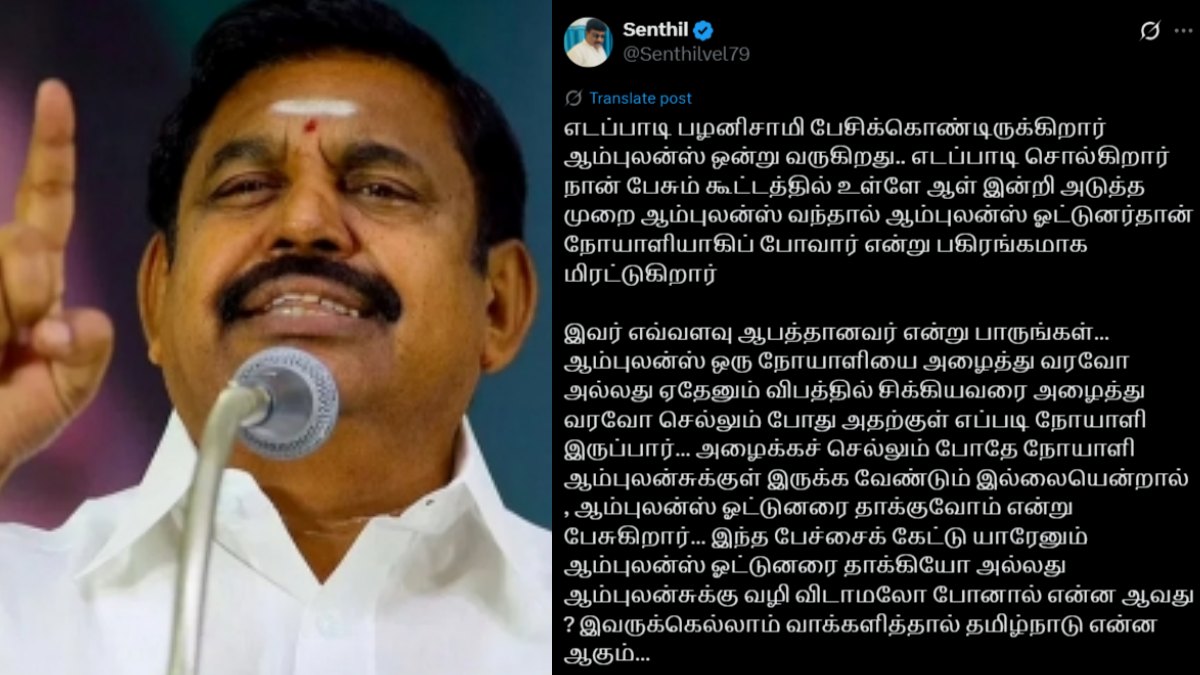 இன்னொரு நெட்டிசன் எழுப்பிய கேள்வியில், எடப்பாடி பழனிசாமி பேசிக்கொண்டிருக்கிறார் ஆம்புலன்ஸ் ஒன்று வருகிறது.. எடப்பாடி சொல்கிறார் நான் பேசும் கூட்டத்தில் உள்ளே ஆள் இன்றி அடுத்த முறை ஆம்புலன்ஸ் வந்தால் ஆம்புலன்ஸ் ஓட்டுனர்தான் நோயாளியாகிப் போவார் என்று பகிரங்கமாக மிரட்டுகிறார்