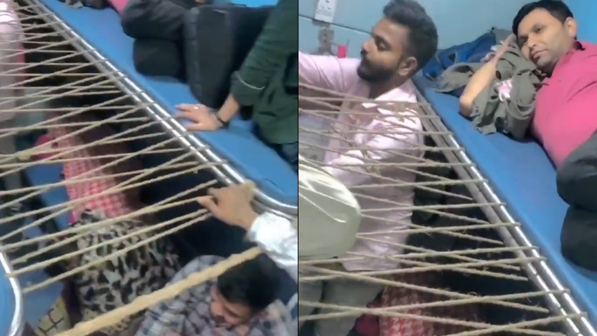 வழக்கமாக முன்பதிவு செய்யப்படாத பெட்டிகளில் கீழே இருக்கையும் மேலே லக்கேஜ்களை வைப்பதற்காக தனியாக ஒரு போர்சனும் அமைக்கப்படும். இந்த நிலையில் லக்கேஜ் போர்ஸன்களை கயிறு கொண்டு கட்டி அதனையே கட்டிலாக மாற்றி பயணத்திருக்கின்றனர் சில இளைஞர்கள். தற்போது அந்த வீடியோ சமூக வலைதளங்களில் அதிகமாக பகிரப்பட்டு வருகிறது.