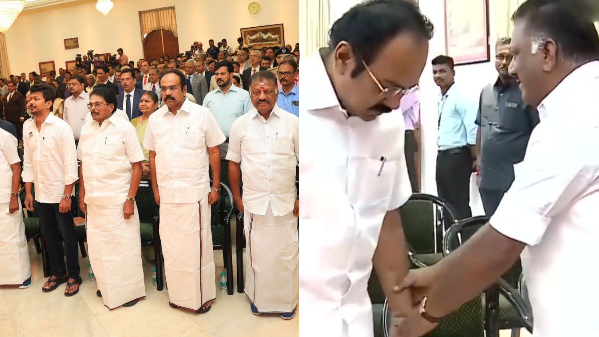 சிரித்த முகத்துடன் பதவியேற்பு விழாவுக்கு வந்த ஓ.பன்னீர்செல்வத்தை திமுக அமைச்சர்கள் சேகர்பாபு, ரகுபதி, கே.கே.எஸ்.எஸ்.ஆர்.ராமச்சந்திரன், தங்கம் தென்னரசு ஆகியோர் எழுந்து நின்று கைகூப்பியும், அவருக்கு கைகுலுக்கியும் வரவேற்றனர்.