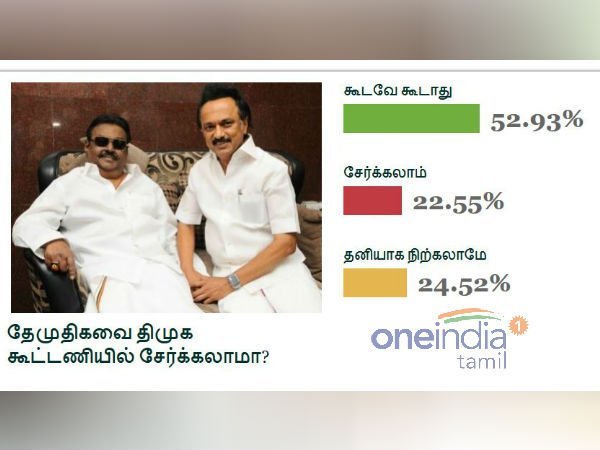 அதன்படி திமுக கூட்டணியில் தேமுதிக சேர கூடாது. இரண்டு கட்சிகளும் கூட்டணி அமைக்க கூடாது என்று நிறைய பேர் கருத்து தெரிவித்துள்ளனர். மொத்தம் 52.87% பேர் திமுக - தேமுதிக கூட்டணி வைக்க கூடாது என்று கூறியுள்ளனர்.