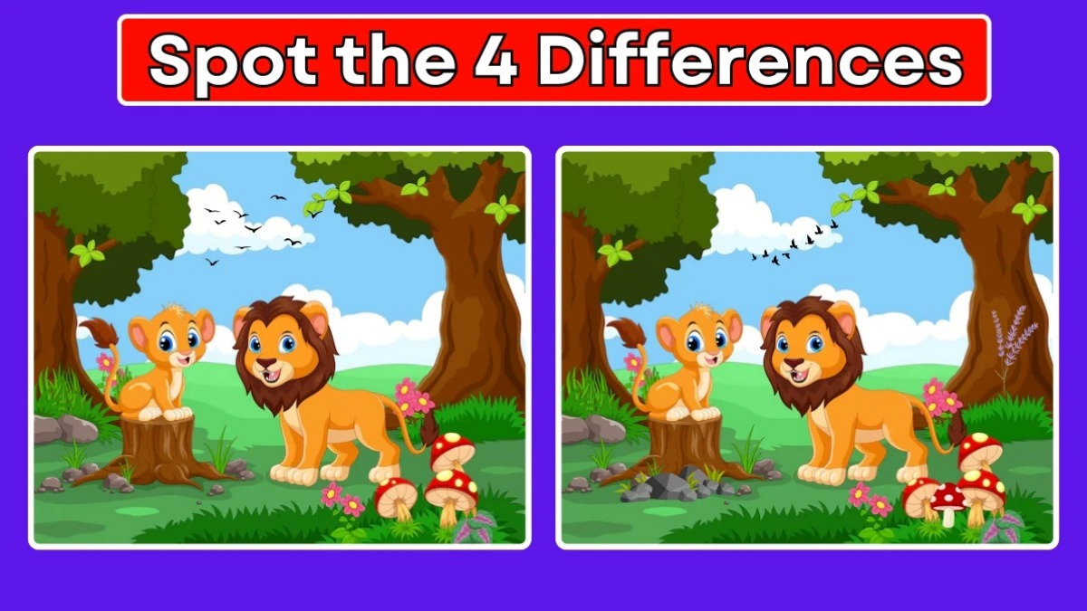 படத்தை நன்றாக பாருங்கள். இரண்டு இமேஜுமே பார்ப்பதற்கு ஒரே மாதிரியாக உள்ளது. ஆனால் நன்றாக உற்று பார்த்தால் 4 வித்தியாசங்கள் இருப்பது தெரியும். இங்கே உள்ள படத்தில் பச்சை பசேல் நிறைந்த வனப்பகுதியில் சிங்கம், பூனை ஆகிய விலங்குகள் உள்ளன. அதுபோக ஆங்காங்கே காளான், பறவைகள் தென்படுகின்றன.