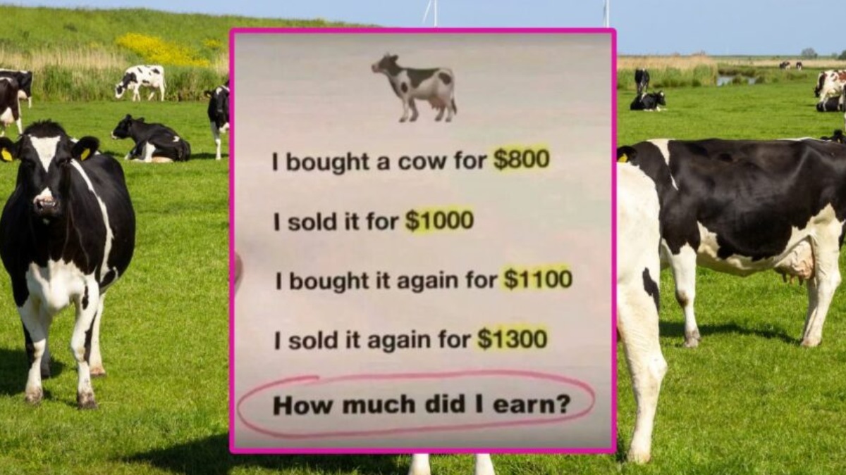 அந்த மாட்டை 1000-க்கு விற்பனை செய்கிறார்... பின்னர் மீண்டும் அந்த மாட்டை 1,100 க்கு வாங்கி, 1,300 க்கு விற்பனை செய்கிறார். இப்போது, மாடு விற்பனை செய்ததன் மூலம் அந்த விவசாயிக்கு கிடைத்த லாபம் எவ்வளவு? இதைத்தான் நீங்கள் கண்டுபிடிக்க வேண்டும்... 30 செகண்ட் டைம் கண்டுபிடித்து விடையை சொல்லுங்கள் பார்க்கலாம்...