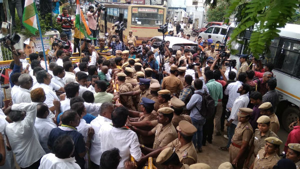 ப.சிதம்பரம் கைது.. போர்க்களமான சத்தியமூர்த்தி பவன்.. போராடிய குமரி ஆனந்தன் உள்ளிட்டோர் கைது