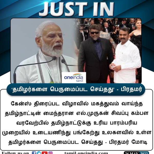 பிரான்ஸ் நாட்டின் கேன்ஸ் திரைப்பட விழா நடந்து வருகிறது. மகத்துவம் வாய்ந்த தமிழ்நாட்டின் மைந்தரான எல் முருகன் சிவப்பு கம்பள வரவேற்பில் தமிழ்நாட்டுக்கு உரிய பாரம்பரிய முறையில் உடையணிந்து பங்கேற்றார். உலகளவில் உள்ள தமிழர்களை பெருமைப்பட செய்தது - பிரதமர் மோடி