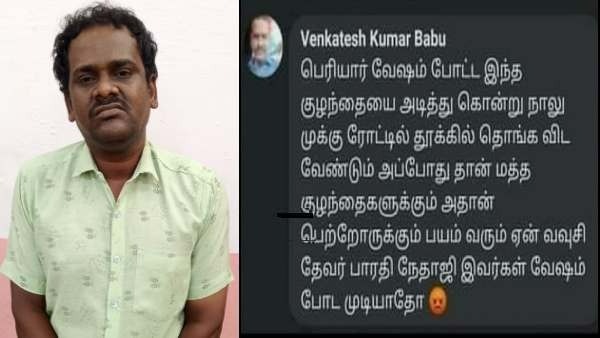 சென்னை : பெரியார் வேடமிட்ட குழந்தையை கொன்று ரோட்டில் தொங்கவிட வேண்டும் என்று பேஸ்புக்கில் பதிவு செய்த பேரூராட்சி பணியாளரை காவல்துறையினர் கைது செய்து விசாரணை மேற்கொண்டு வருகின்றனர்.