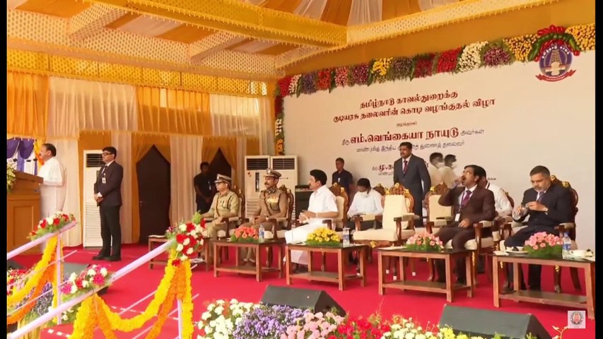 முதல்வர் ஸ்டாலின் தலைமையில் நடைபெற்ற விழாவில் சிறப்பு கவுரவ கொடியை துணை ஜனாதிபதி, முதல்வர் ஸ்டாலினிடம் வழங்கினார். இந்த நிகழ்ச்சியில் தமிழக சட்டம் ஒழுங்கு டிஜிபி சைலேந்திரபாபு மற்றும் சென்னை மாநகர போலீஸ் கமிஷனர் சங்கர் ஜிவால் உள்ளிட்ட காவல்துறை மூத்த அதிகாரிகள், அமைச்சர்கள், எம்.எல்.ஏ.க்கள் உள்ளிட்ட பலர் கலந்து கொண்டனர்.