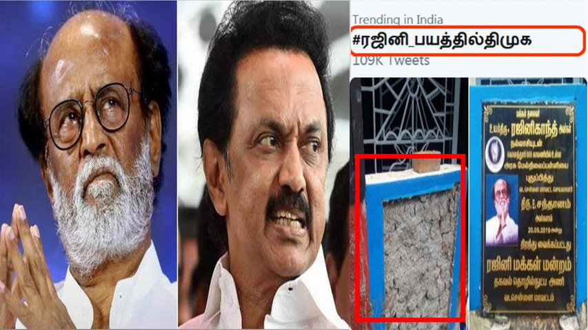 இந்த கல்வெட்டை திமுகவினர்தான் அகற்றியதாக ரஜினி ரசிகர்கள் குற்றம்சாட்டினர். அதே வேகத்துடன் ட்விட்டரில் #ரஜினி_பயத்தில்திமுக! என்ற ஹேஷ்டேக்கை உருவாக்கி கடந்த சில நாட்களாக டிரெண்டிங்காக்கி வருகின்றனர்.