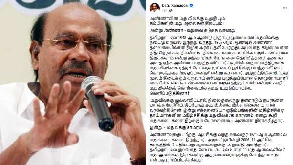சென்னை: அண்ணாவின் மதுவிலக்கு உறுதியும், தம்பிகளின் மது ஆலைகள் திறப்பும் என்ற தலைப்பில் பாமக நிறுவனர் ராமதாஸ் தனது முகநூலில் ஒரு கட்டுரையை பதிவிட்டுள்ளார்.