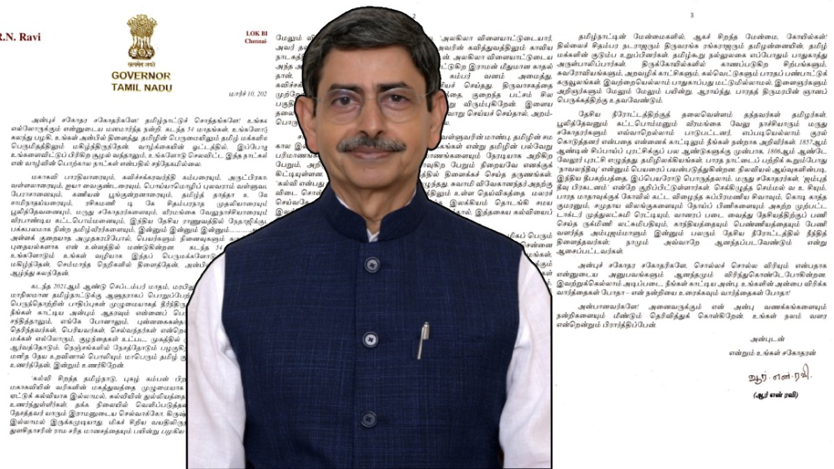 சென்னை: தமிழ்நாடு ஆளுநராக பணியாற்றி வந்த ஆர்என் ரவி தற்போது மேற்கு வங்க மாநிலத்திற்கு மாற்றப்பட்டுள்ளார். இந்த நிலையில் தமிழகத்தில் இருந்து செல்லும் அவர் தமிழ்நாட்டு மக்களுக்கு மூன்று பக்க கடிதம் எழுதியிருக்கிறார். அதில், தனது நினைவலைகளை பகிர்ந்து கொண்ட அவர் தமிழ்நாட்டைப் பற்றி பேசுவதற்கு வார்த்தைகள் போதவில்லை என குறிப்பிட்டுள்ளார்.