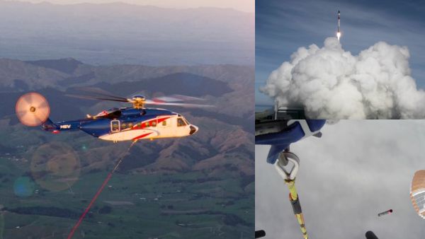 அது அப்படியே கடலில் விழும். இந்த நிலையில்தான் நேற்று அந்த நிறுவனம் அனுப்பிய எலக்ட்ரான் ராக்கெட்டை புதிய விதத்தில் பூமிக்கு கொண்டு வந்துள்ளனர். அதன்படி ராக்கெட் லேபின் எலக்ட்ரான் ராக்கெட் விண்ணுக்கு ஏவப்பட்ட பின் அதன் முதல் ஸ்டேஜ் இரண்டரை நிமிடத்தில் பிரிந்தது. அதன்பின் சில நொடிகளில் அது பாராசூட்டை திறந்து பூமியை நோக்கி வேகமாக வந்தது. இந்த முதல் ஸ்டேஜ் பெரிய 4 மாடி கட்டிடம் அளவிற்கு உயரம் கொண்டு இருக்கும். அந்த நேரத்தில் சரியாக இன்னொரு பக்கம் ராக்கெட் லேப் நிறுவனத்தின் Sikorsky S-92 ஹெலிகாப்டர் வானத்தில் பறந்து கொண்டு இருந்தது.