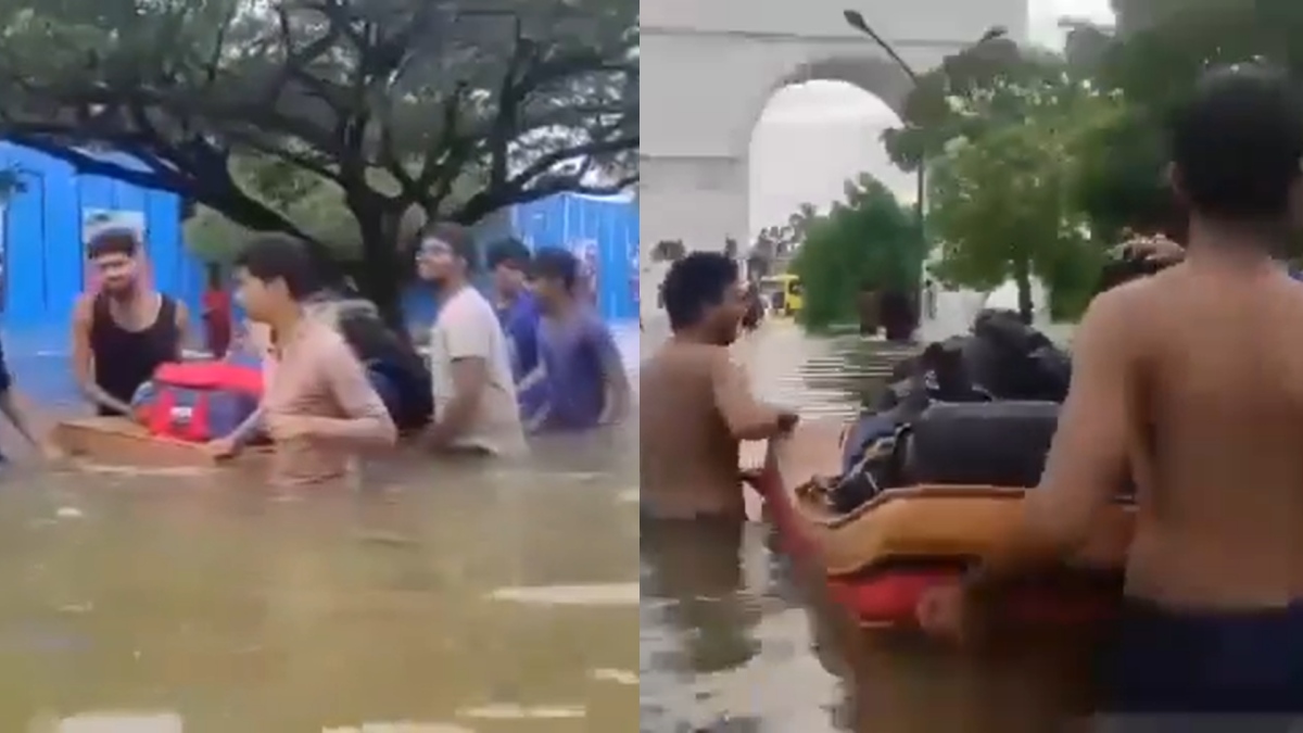 சென்னை: சென்னையில் பல்வேறு இடங்களில் மழை காரணமாக முழங்கால் அளவுக்கு தண்ணீர் தேங்கி உள்ள நிலையில், சதியபாமா பல்கலைக்கழக மாணவர்கள் படகில் உடைமைகளுடன் செல்வது போன்ற ஒரு வீடியோ சமூக வலைதளங்களில் வேகமாக பரவி வருகிறது. அதில் இடுப்பளவு தண்ணீரில் உடைமைகளை எடுத்துச் செல்லும் மாணவர்கள், இந்த பல்கலைக்கழகத்தில் சேராதீர்கள் என பேசுவது தற்போது அதிகமாக பகிரப்பட்டு வருகிறது.
