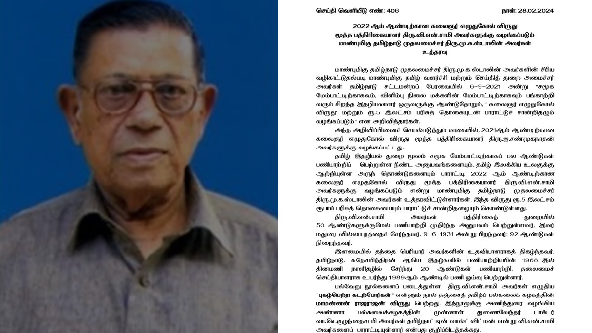 சென்னை: மூத்த பத்திரிகையாளர் வி.என்.சாமிக்கு 'கலைஞர் எழுதுகோல் விருது' மற்றும் ரூ. 5 லட்சம் ரொக்கப் பணம் வழங்கப்படும் என்று முதலமைச்சர் மு.க.ஸ்டாலின் அறிவித்துள்ளார்.