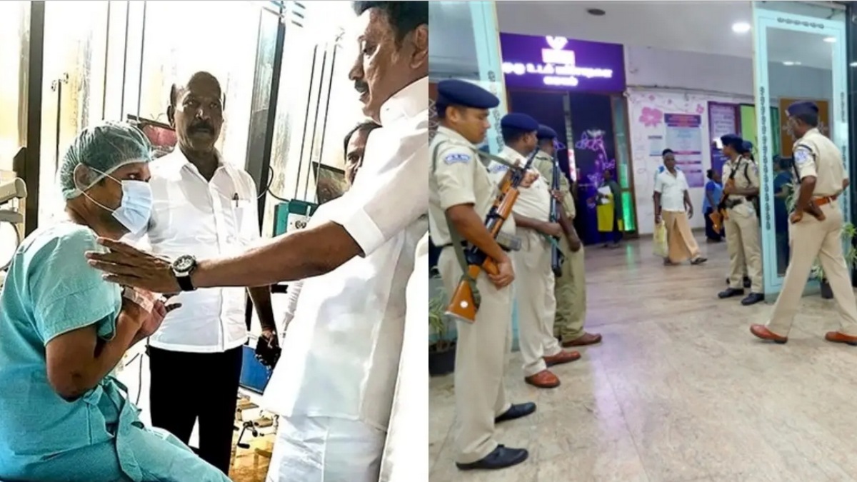 காவேரி மருத்துவமனை வளாகத்தில் இரண்டு உதவி ஆணையர்கள் 4 ஆய்வாளர்கள் மற்றும் 50க்கும் மேற்பட்ட காவலர்கள் பாதுகாப்பில் ஈடுபட்டுள்ளனர்.
