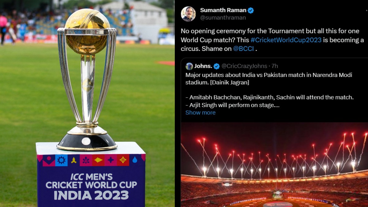 முதல் நாள் தொடக்க விழா நடத்தாமல் இப்போது நடத்துவதை விமர்சனம் செய்துள்ளனர். இதை கிண்டல் செய்துள்ள கிரிக்கெட் விமர்சகர் சுமந்த் சி ராமன், தொடருக்கான தொடக்க விழா நடத்தப்படவில்லை. ஆனால் ஒரே ஒரு உலக கோப்பை போட்டிக்கு இதெல்லாம் தேவையா? இந்த #CricketWorldCup2023 சர்க்கஸாக மாறி வருகிறது. பிசிசிஐ அமைப்பை நினைத்தால் அசிங்கமாக இருக்கிறது என்று சுமந்த் சி ராமன் கூறியுள்ளார்.