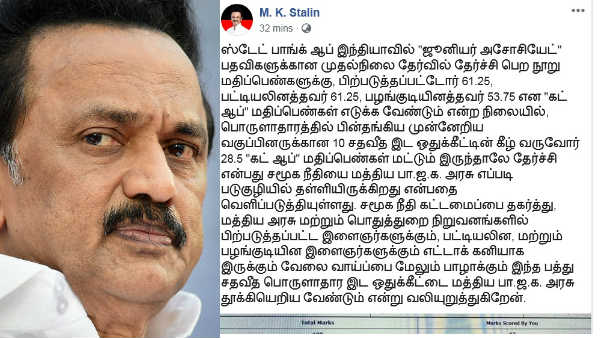 ஸ்டேட் பாங்க் ஆப் இந்தியாவில் "ஜூனியர் அசோசியேட்" பதவிகளுக்கான முதல்நிலை தேர்வில் தேர்ச்சி பெற நூறு மதிப்பெண்களுக்கு, பிற்படுத்தப்பட்டோர் 61.25, பட்டியலினத்தவர் 61.25, பழங்குடியினத்தவர் 53.75 என "கட் ஆப்" மதிப்பெண்கள் எடுக்க வேண்டும் என்ற நிலையில், பொருளாதாரத்தில் பின்தங்கிய முன்னேறிய வகுப்பினருக்கான 10 சதவீத இட ஒதுக்கீட்டின் கீழ் வருவோர் 28.5 "கட் ஆப்" மதிப்பெண்கள் மட்டும் இருந்தாலே தேர்ச்சி என்பது சமூக நீதியை மத்திய பா.ஜ.க. அரசு எப்படி படுகுழியில் தள்ளியிருக்கிறது என்பதை வெளிப்படுத்தியுள்ளது.