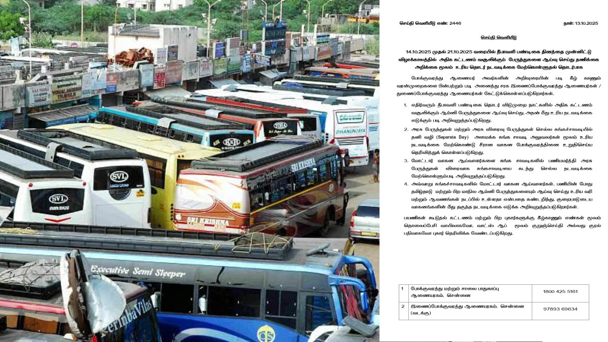 14.10.2025 முதல் 21.10.2025 வரையில் தீபாவளி பண்டிகை தினத்தை முன்னிட்டு விழாக்காலத்தில் அதிக கட்டணம் வசூலிக்கும் பேருந்துகளை ஆய்வு செய்து தணிக்கை அறிக்கை மூலம் உரிய தொடர் நடவடிக்கை மேற்கொள்ளுதல் தொடர்பாக தமிழக அரசு சில நெறிமுறைகளை வெளியிட்டுள்ளதோடு, புகார் எண்களையும் அறிவித்துள்ளது.