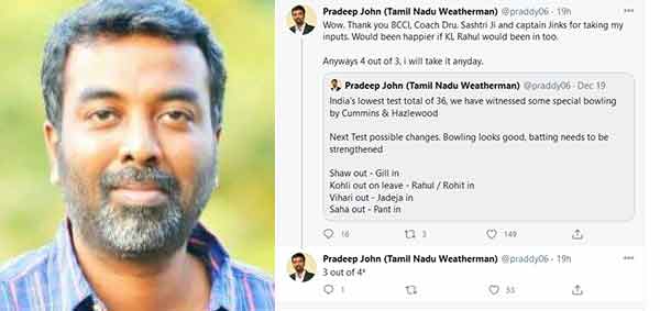 வெதர் போலவே, கிரிக்கெட்டிலும் இவர் கணிப்பு அப்படியே பொருந்திப்போவதுதான் ஆச்சரியம். டிசம்பர் 19ம் தேதி பிரதீப் ஜான் வெளியிட்ட டுவிட்டர் பதிவில், இந்தியா 36 ரன்களில் ஆல்-அவுட்டாகியுள்ளது. எனவே அடுத்த போட்டியில் பேட்டிங்கை வலிமைப்படுத்த வேண்டும். பிரிதிவ் ஷாவுக்கு பதில் சுபம் கில், கோலி லீவில் போவதால், ராகுல் அல்லது ரோகித் உள்ளே, விகாரிக்கு பதில் ஜடேஜா, விருதிமான் சாஹாவுக்கு பதில், ரிஷப் பந்த் ஆகியோரை களமிறக்க வேண்டியது அவசியம் என கூறினார் பிரதீப்.