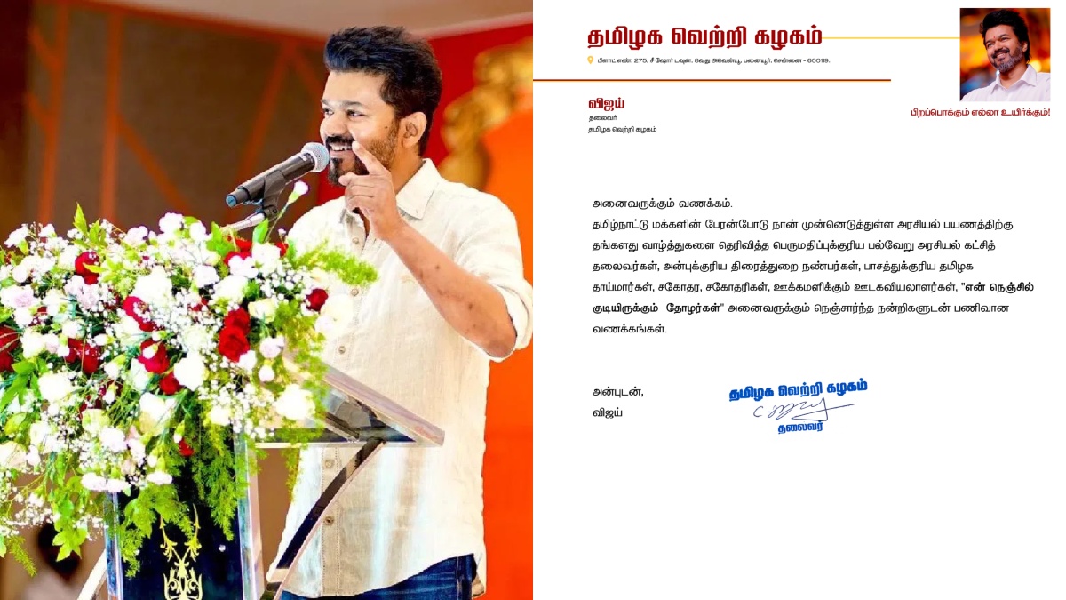 சென்னை: தமது அரசியல் பயணத்துக்கு வாழ்த்து தெரிவித்தோருக்கு நன்றி தெரிவித்த அனைவருக்கும் தமிழக வெற்றி கழகத்தின் தலைவர் நடிகர் விஜய் நன்றி தெரிவித்துள்ளார்.