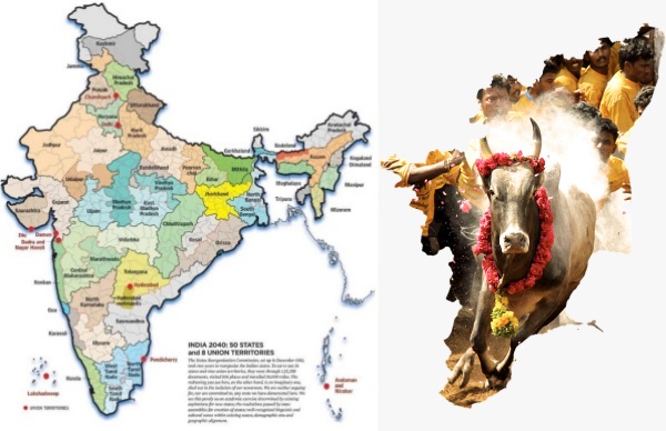 "இந்தியா 2040: 50 மாநிலங்களும் 8 யூனியன் பிரதேசங்களும்" என்று குறிப்பிடப்பட்டு இருக்கும் அந்த மேப்பில் மேற்கு தமிழ்நாடு, தென் தமிழ்நாடு, வட தமிழ்நாடு என்று குறிப்பிடப்பட்டு இருக்கிறது. சென்னை, திருவள்ளூர், செங்கல்பட்டு, காஞ்சிபுரம், ராணிப்பேட்டை, வேலூர், திருப்பத்தூர், திருவண்ணாமலை, விழுப்புரம், கள்ளக்குறிச்சி, கடலூர், அரியலூர், பெரம்பலூர், திருச்சி, தஞ்சை, திருவாரூர், மயிலாடுதுறை, நாகை ஆகிய மாவட்டங்கள் வட தமிழ்நாட்டில் உள்ளன.