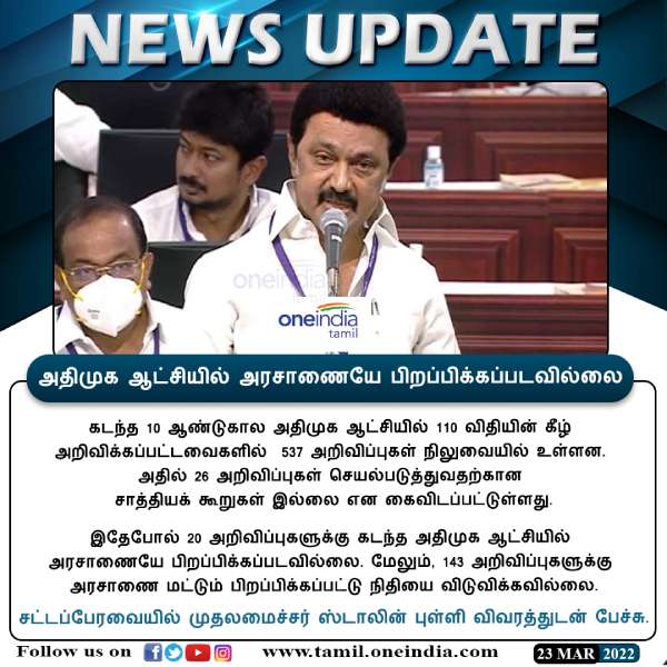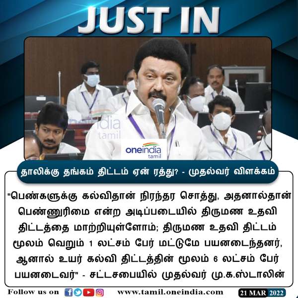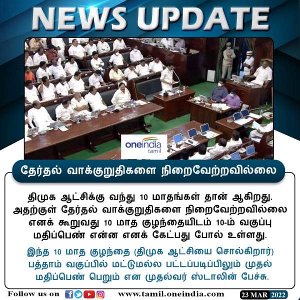 திமுக ஆட்சிக்கு வந்து 10 மாதங்கள் தான் ஆகிறது. அதற்குள் தேர்தல் வாக்குறுதிகளை நிறைவேற்றவில்லை எனக் கூறுவது 10 மாத குழந்தையிடம் 10-ம் வகுப்பு மதிப்பெண் என்ன எனக் கேட்பது போல் உள்ளது. இந்த 10 மாத குழந்தை (திமுக ஆட்சியை சொல்கிறார்) பத்தாம் வகுப்பில் மட்டுமல்ல பட்டப்படிப்பிலும் முதல் மதிப்பெண் பெறும் என முதல்வர் ஸ்டாலின் பேச்சு.