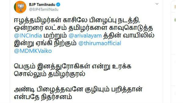 மற்றொரு ட்வீட்டில், லண்டனுக்கு விடுதலை சிறுத்தைகள் கட்சித் தலைவர் திருமாவளவன் சென்றபோது, அவருக்கு எதிராக ஈழத் தமிழர்கள் மற்றும் புலம்பெயர் தமிழர்கள் போராட்டம் நடத்தியதாக ஒருவர் வீடியோவில் பேசக்கூடிய பதிவை, ஷேர் செய்துள்ளது பாஜக ட்விட்டர் ஐடி. இதன் மூலம் திருமாவளவனையும் சீண்டி உள்ளது பாஜக. விதவிதமான பதிவுகளால் பாஜக ஐடி விங்க் களைகட்டி நெட்டிசன்களின் பேசு பொருளாக மாறியுள்ளது என்னவோ உண்மை.