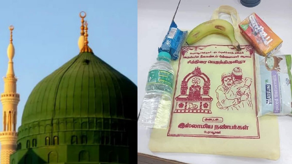 அரவணைப்பு: இந்து கடவுள் உருவம் பொறிக்கப்பட்ட அந்த பையில், இஸ்லாமிய சகோதரர்களை ஒருவரையொருவர் அரவணைத்தபடி போட்டோவும் இடம்பெற்றுள்ளது. அந்த தாம்பூல பையில், ஒரு வாட்டர் பாட்டில், ஒரு பிஸ்கட் பாக்கெட், 1 மோர் பாக்கெட், 1 கூல் டிரிங்க்ஸ் பாக்கெட் போன்றவற்றை வைத்து, பக்தர்களுககு விநியோகித்து வருகிறார்கள்.