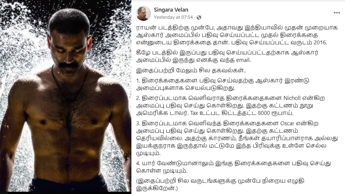 இந்நிலையில் சிங்கார வேலன் என்பவர் ஃபேஸ்புக்கில் ஒரு பதிவை வெளியிட்டுள்ளார். அதில் தனது திரைக்கதைதான் இந்தியாவிலிருந்து ஆஸ்கர் நூலகத்தில் பதிவு செய்யப்பட்ட முதல் திரைக்கதை தன்னுடையது தான் என்று அதில் குறிப்பிட்டுள்ளார். சிங்கார வேலன் அவரது ஃபேஸ்புக் பதிவில், "ராயன் படத்திற்கு முன்பே, அதாவது இந்தியாவில் முதன்முறையாக ஆஸ்கர் அமைப்பில் பதிவு செய்யப்பட்ட முதல் திரைக்கதை என்னுடைய திரைக்கதை தான். பதிவு செய்யப்பட்ட வருடம் 2016. கீழே படத்தில் இருப்பது பதிவு செய்யப்பட்டதற்காக ஆஸ்கர் அமைப்பிலிருந்து எனக்கு வந்த இமெயில். இதைப்பற்றி மேலும் சில தகவல்கள்.