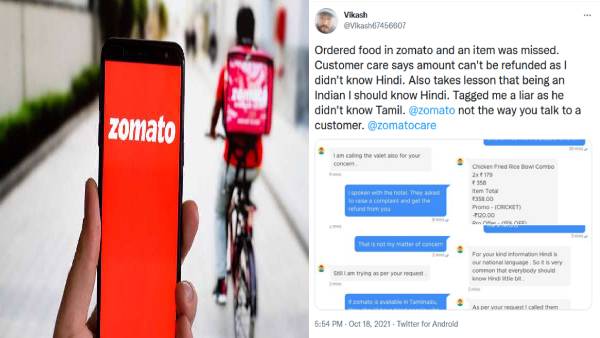 சொமேட்டோ நிறுவனத்தின் ஊழியர் ஒருவர் ஆகாஷ் என்ற தமிழரிடம் இந்தி குறித்து பேசியது இணையத்தில் சர்ச்சையாகி உள்ளது. ஆர்டர் செய்த உணவு முழுதாக கிடைக்கவில்லை என்று கஸ்டமர் கேரில் புகார் அளித்த ஆகாஷிடம் சொமேட்டோ கஸ்டமர் கேர் ஊழியர் பேசிய விதம்தான் சர்ச்சையாகி உள்ளது.