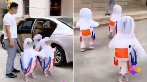 அந்த வீடியோவில் சிறு குழந்தைகள் முழுகவச உடை அணிந்தபடி செல்கிறார்கள். கண்ணுக்கு கண்ணாடி அணிந்திருக்கிறார்கள். விண்வெளிக்கு செல்லும் வீரர்கள் போல் உடை அணிந்து செல்கிறார்கள். மருத்துவர்கள் அணியும் கவச உடை போலவும் உள்ளது. கொரோனா பரவும் வேகத்தை பார்த்தால் இப்படி ஒரு உடை அணிந்துதான் உலகின் பல நாடுகளில் பள்ளிகளில் எல்கேஜி திறக்கப்படுமோ என்ற சந்தேகத்தை ஏற்படுத்துகிறது.