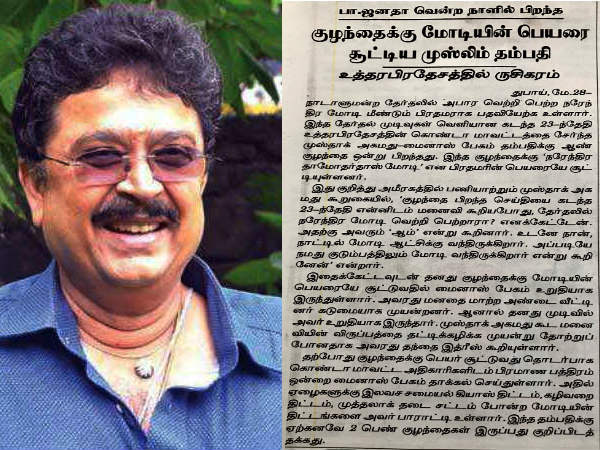 அதில் இதுதான் உண்மையான இந்திய மண் என்று குறிப்பிட்டுள்ள அவர் உத்தரப்பிரதேசத்தில் கடந்த 23ஆம் தேதி இஸ்லாமிய தம்பதிக்கு பிறந்த குழந்தைக்கு நரேந்திரமோடி என பெயர் சூட்டப்பட்ட செய்தியை சுட்டிக்காட்டியுள்ளார்.