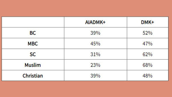 மத அடிப்படையிலான பகுப்பாய்வையும் டுடேஸ் சாணக்யா வெளியிட்டுள்ளது. கிறிஸ்தவர்களில் 48% பேர் திமுகவுக்கும் 39% அதிமுக அணிக்கும் வாக்களித்துள்ளனர் என்கிறது இந்த ஆய்வு. கேரளா, வடகிழக்கு மாநிலங்களில் கிறிஸ்தவர்கள், பாஜகவை வெகுதொலைவில் வைத்து பார்க்கவில்லை. தமிழகத்திலும் கூட அதேபோன்ற நிலைமை உருவாக்கப்பட்டு வருகிறதோ என்பதையே இந்த ஆய்வு சுட்டிக்காட்டுகிறது.