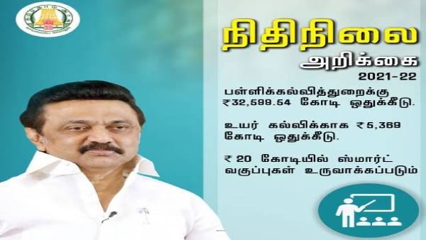 பள்ளிக் கல்விக்கு அதிக முக்கியத்துவம் வழங்கப்படும் வகையில் ரூ32,599.54 கோடி ரூபாய் ஒதுக்கப்பட்டுள்ளது. தேசிய அடைவு ஆய்வு கணக்கெடுப்பின்படி கற்றல் விளைவுகளின் அடிப்படையில் முதல் 3 மாநிலங்களுக்குள் தமிழ்நாடு கொண்டுவரப்படுவதை அரசு உறுதி செய்யும். அனைத்து ஆசிரியர்களுக்கும் தொழில்நுட்ப வசதியுடன் கண்காணிக்கக் கூடிய மற்றும் ஆதாரங்கள் அடிப்படையிலான பயிற்சி வழங்க ஏதுவாக 413 கல்வி ஒன்றியங்களுக்கும் தலா 40 தொடுதிரை கையடக்க கணினிகள் -Tablet ரூ13.22 கோடி மதிப்பீட்டில் வழங்கப்படும்.