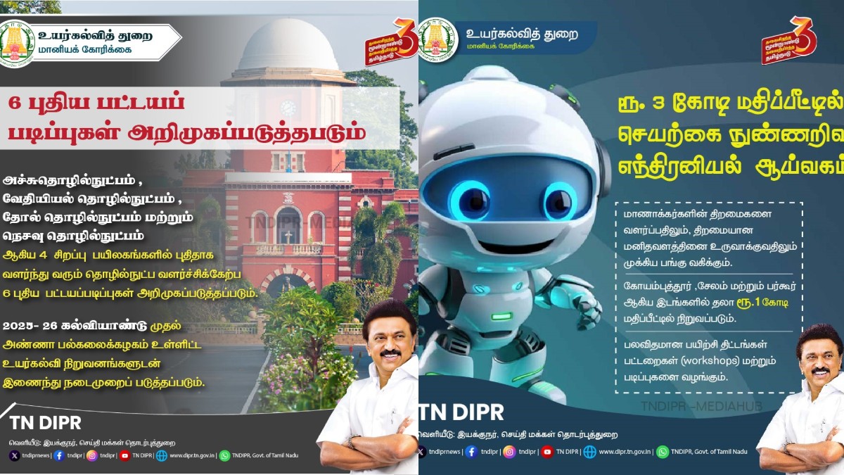 * அச்சு தொழில்நுட்பம், வேதியியல் தொழில்நுட்பம், தோல் தொழில்நுட்பம் மற்றும் நெசவு தொழில்நுட்பம் ஆகிய 4 சிறப்பு பயிலகங்களில் புதிதாக வளர்ந்து வரும் தொழில்நுட்ப வளர்ச்சிக்கேற்ப 6 புதிய பட்டயப்படிப்புகள் அறிமுகப்படுத்தப்படும். 2025-26 கல்வியாண்டு முதல் அண்ணா பல்கலைக்கழகம் உள்ளிட்ட உயர்கல்வி நிறுவனங்களுடன் இணைந்து நடைமுறைப் படுத்தப்படும்.