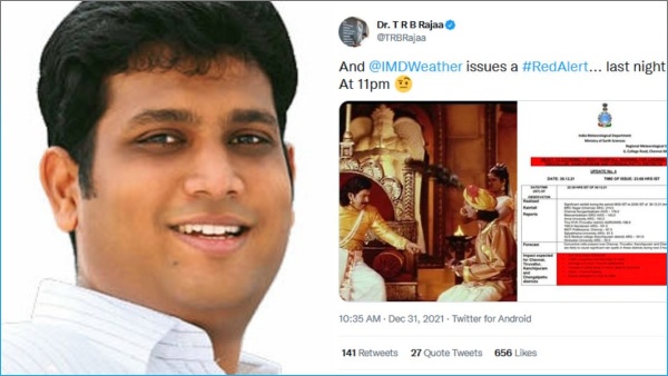 சென்னையில் பெருமழை கொட்டித்தீர்த்து வெள்ளம் தேங்கிய நிலையில் இந்திய வானிலை மையம் அறிவிப்பை கேலியாக பகிர்ந்துள்ளார் எம்எல்ஏ டிஆர்பி ராஜா.