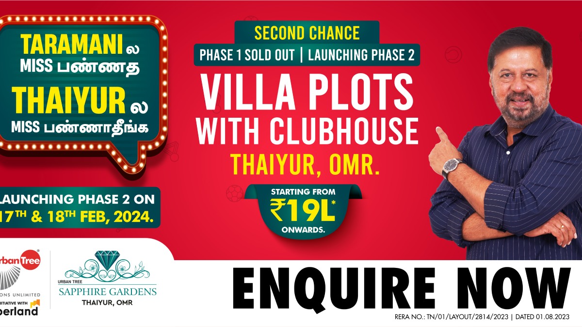 சென்னை: சொந்த வீட்டு மனை வாங்கும் கனவை அர்பன் ட்ரீ தொடர்ந்து நிஜமாக்கி வருகிறது. இந்நிலையில், OMR இன் முதல் கிளப் ஹவுஸ் உடன் இருக்கும் பிளாட்டட் டெவலப்மென்ட் SAPPHIRE GARDENS-ன் இரண்டாம் கட்ட மனைகளுக்கான பிரமாண்டமான வெளியீட்டு விழாவிற்கு அர்பன் ட்ரீ உங்களை அன்புடன் அழைக்கிறது.
