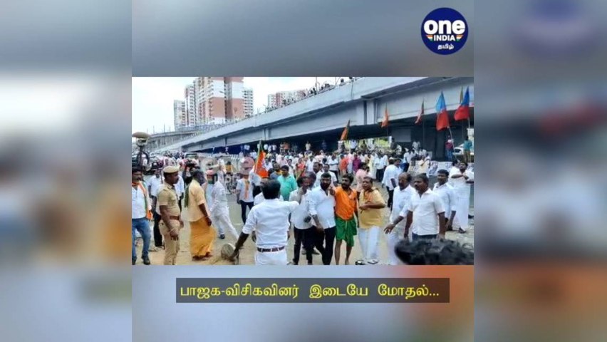 பாஜகவினர் அம்பேத்கர் சிலைக்கு மாலை அணிவிக்க கூடாது என விடுதலை சிறுத்தைகளின் நிர்வாகிகள் கடும் எதிர்ப்பு தெரிவித்தனர். இதனால் தள்ளு முள்ளு ஏற்பட்டு திடீரென பரபரப்பு நிலவியது. சிலர் கொடி கம்பங்களால் போலீசார் முன்பு தாக்கினர். ஒரு பெண் நிர்வாகி பெரிய கல்லை தூக்கிக் கொண்டு ஓட ஓட விரட்டினார் அந்த வீடியோ காட்சிகள் வெளியாகி பரபரப்பை ஏற்படுத்தியது.